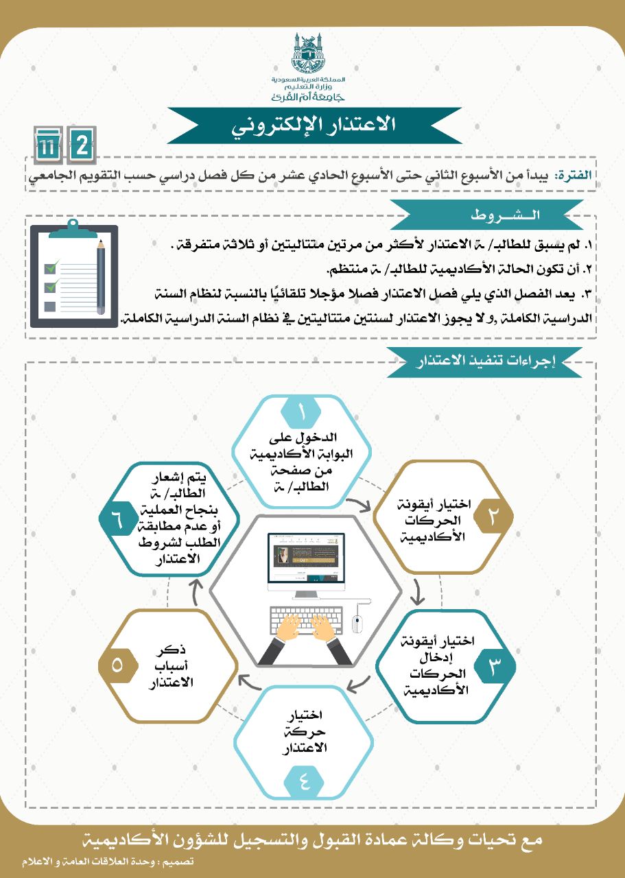 عمادة القبول والتسجيل تعلن بدء فترة الاعتذار الإلكتروني للفصل الدراسي الثاني 1441هـ عمادة القبول والتسجيل وكالة الجامعة للشؤون التعليمية جامعة أم القرى